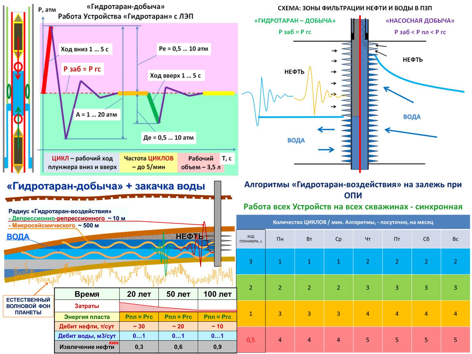 Бесконечное число исследований и попыток совместить импульсное/волновое/сейсмическое/ультразвуковое/акустическое/вибро.. и тп воздействие с добычей нефти созданием длительной депрессии, т.е. Насосным способом добычи, ни к чему хорошему не привели .. Это - плохо-совместимые методы ! Но, как только вы переходите от насосной добычи к безводной-фонтанной добыче (воссоздаете условия безводного фонтанирования) все волновые методы воздействия на прискважинную зону и нефтяной пласт, - начинают работать в полной мере !